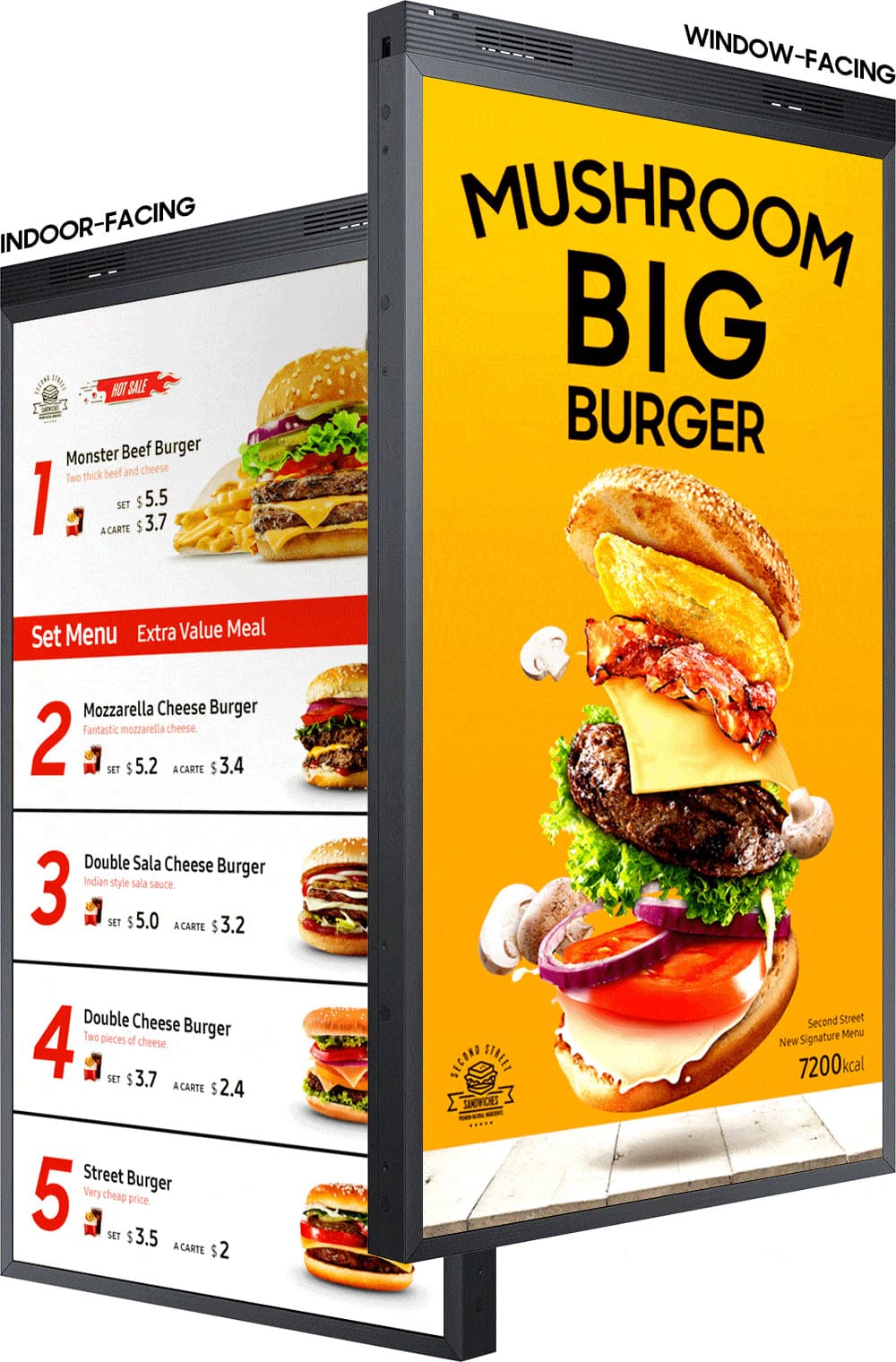 Pantalla doble, efecto doble. Este dispositivo ha sido creado para mejorar el espacio en el que se ubique y ofrecer una visibilidad completa, incluso en el lado que dé directamente al exterior y reciba luz del sol directa. Así, la información que desees transmitir llega de forma precisa a tus clientes y consigue atraer su atención.