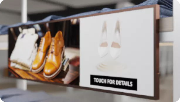 Transforme el entorno minorista con pantallas interactivas que funcionan como soluciones de señalización. Guíe a los clientes fácilmente por la tienda, mejorando su experiencia de navegación.